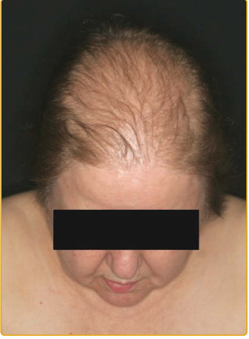 - Slowly progressive; patients often notice reduced hair density rather than dramatic shedding