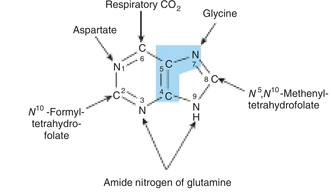 Atoms 4, 5, 7 from glycine; N1 from aspartate; C2, C8 from tetrahydrofolate (THF); N3, N9 from glutamine; C6 from CO₂