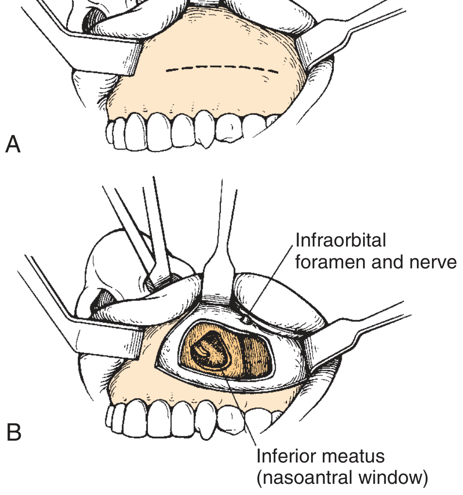 Fig. 44.29 — Caldwell-Luc procedure: (A) Gingivobuccal sulcus incision above canine fossa; (B) Osteotome/drill used to create antral window with nasoantral drainage. — Cummings Otolaryngology