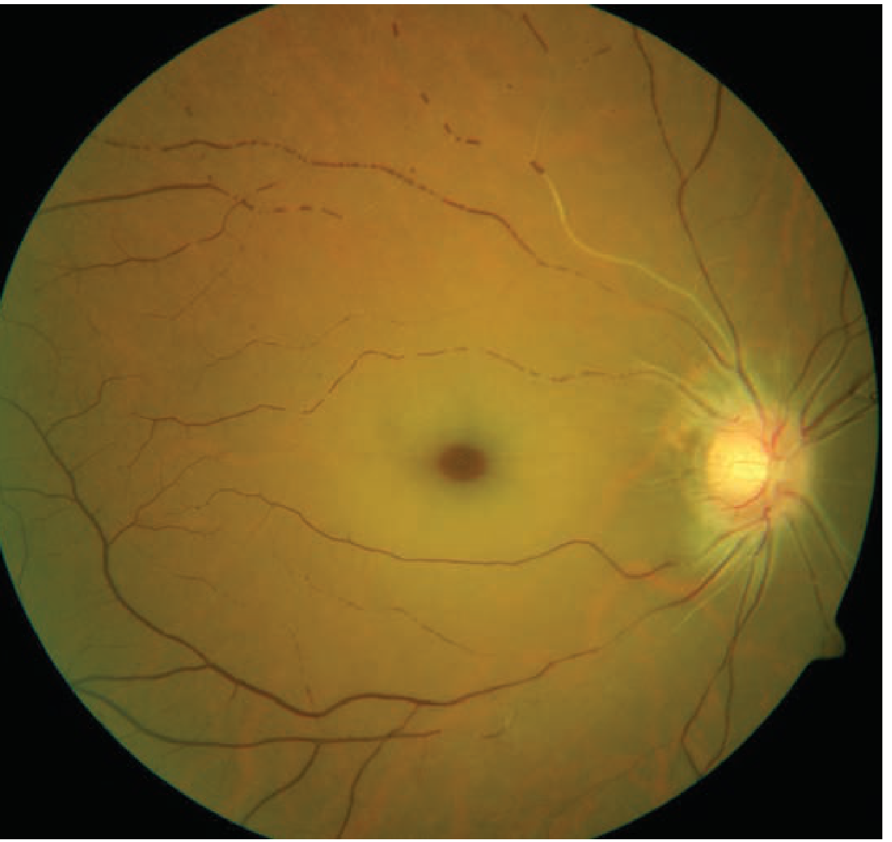 Diffuse retinal pallor with macular cherry-red spot. Note the attenuated arterioles.