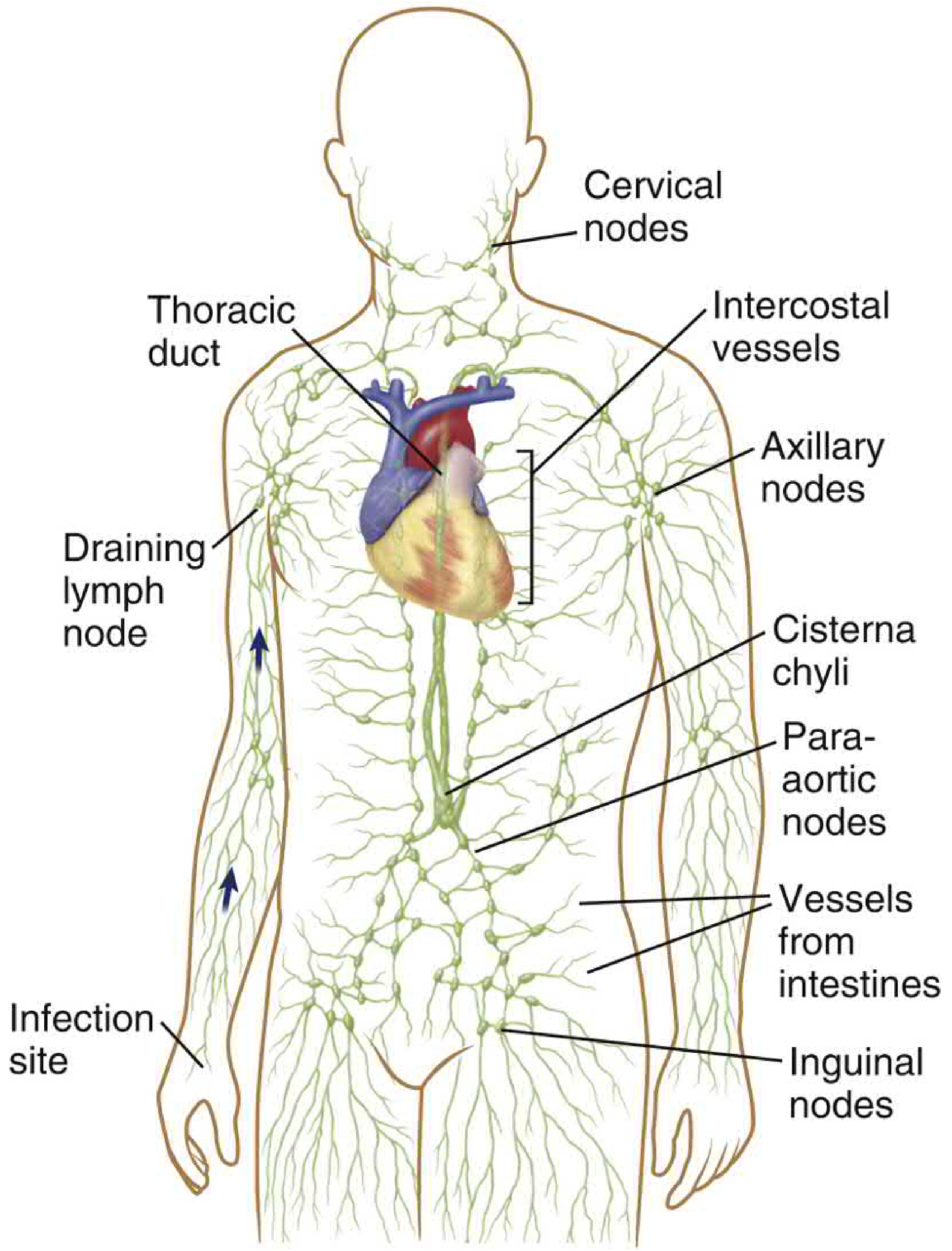 Major node groups include: cervical, axillary, inguinal, para-aortic, and mesenteric nodes.