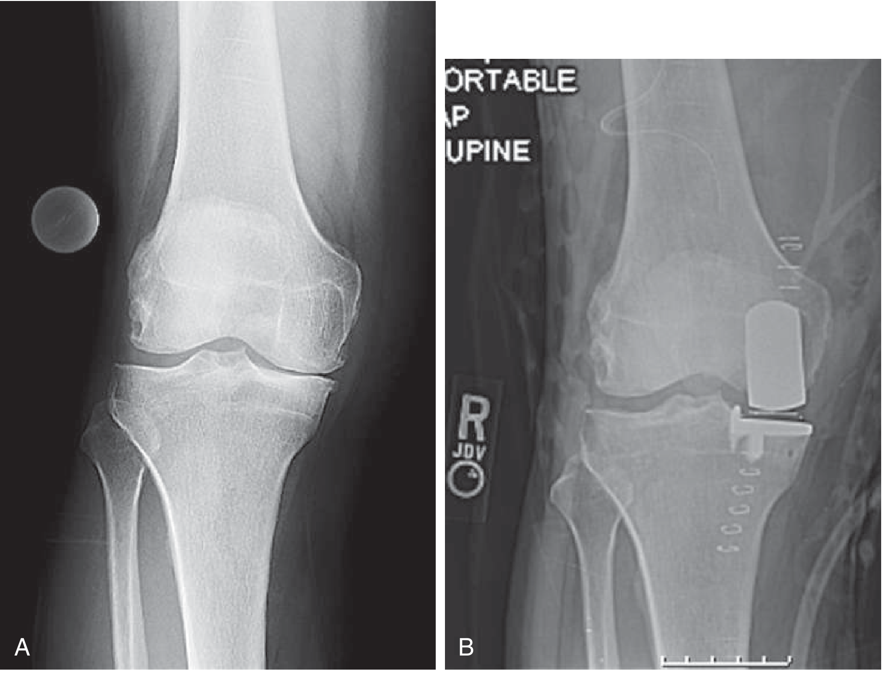 Left: Knee with arthritis limited to the medial compartment. Right: After medial unicompartmental replacement. — Goldman-Cecil Medicine