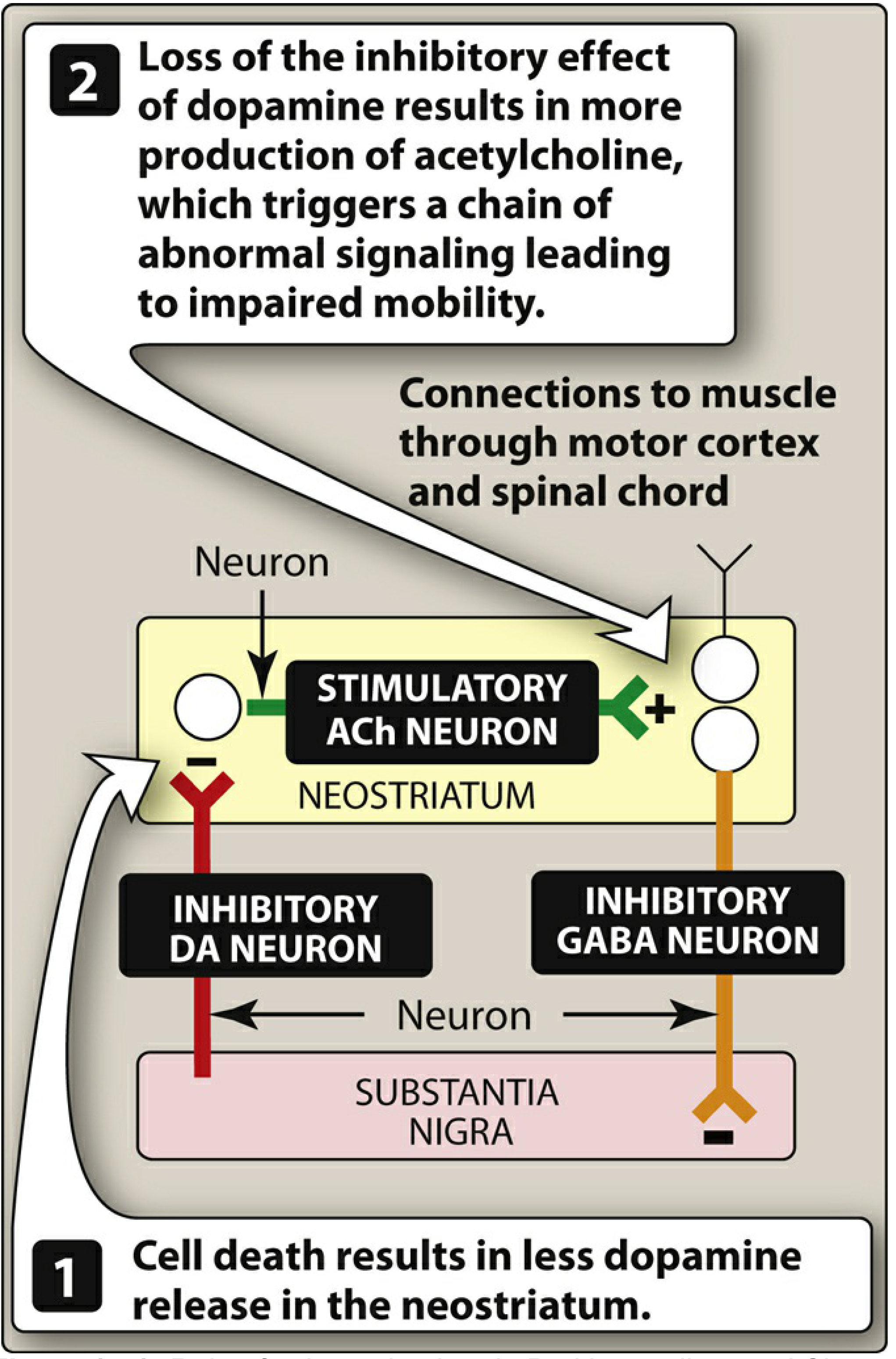 Normally, substantia nigra neurons release inhibitory dopamine onto neostriatal cholinergic neurons. In PD: