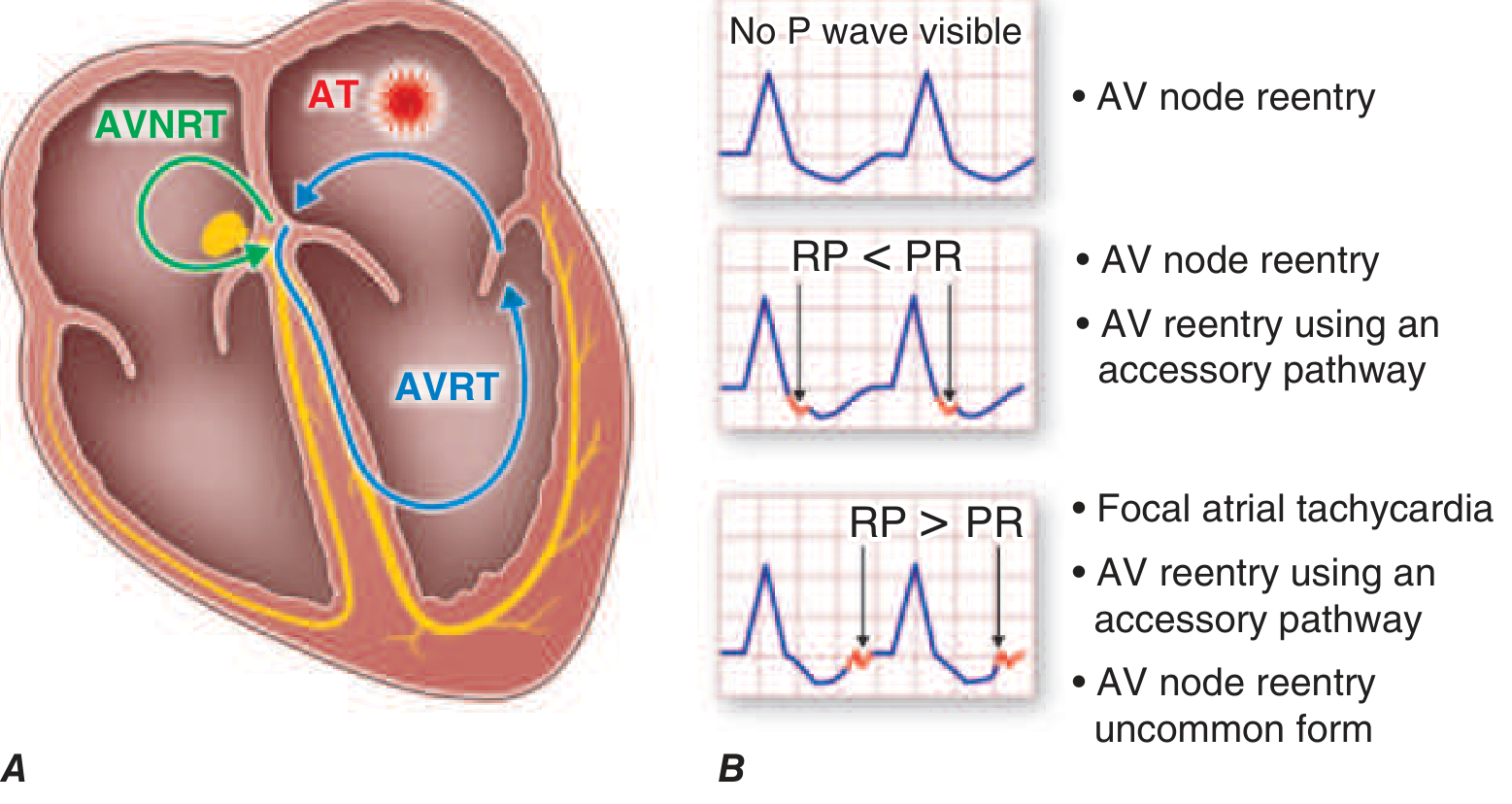 | RP interval | RP < PR → AVNRT or typical AVRT; RP > PR → atypical AVNRT, AT |