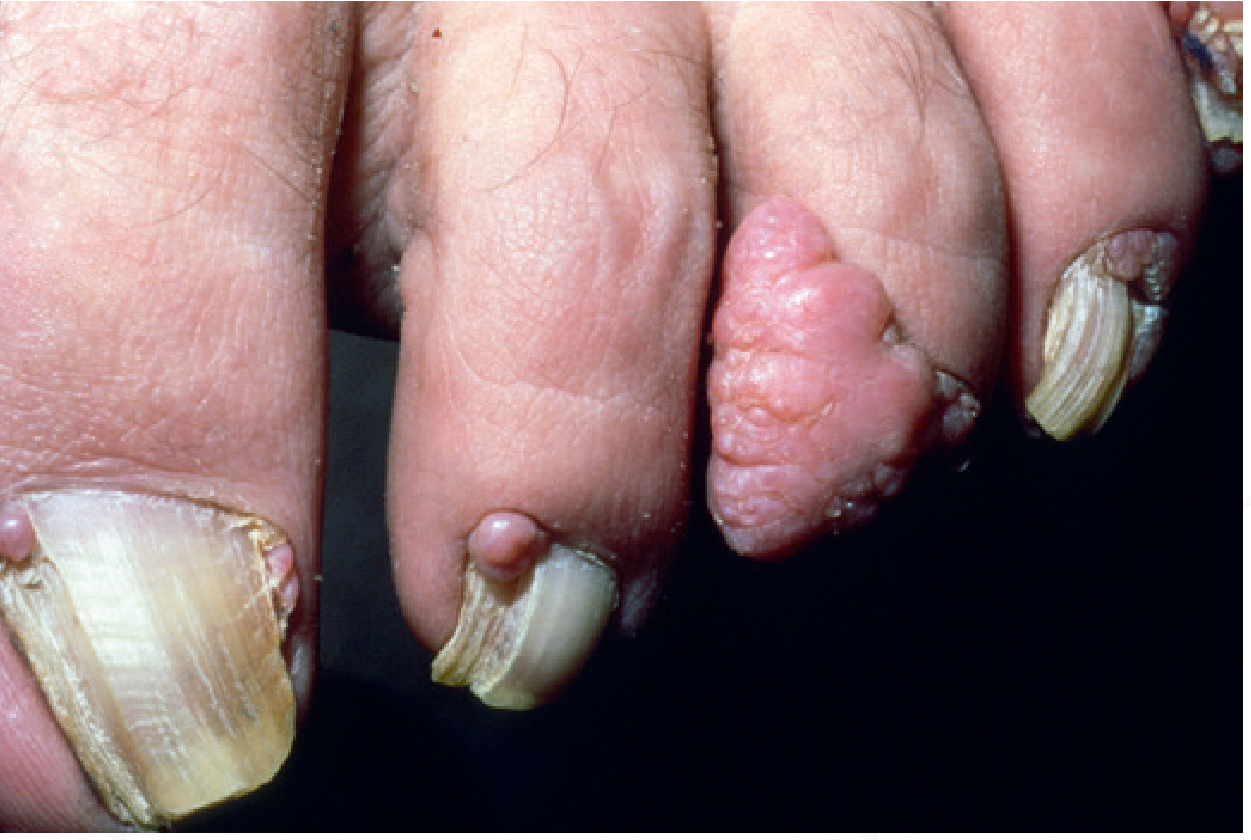 | Periungual/subungual fibromas | Flesh-colored growths emerging from nail folds |