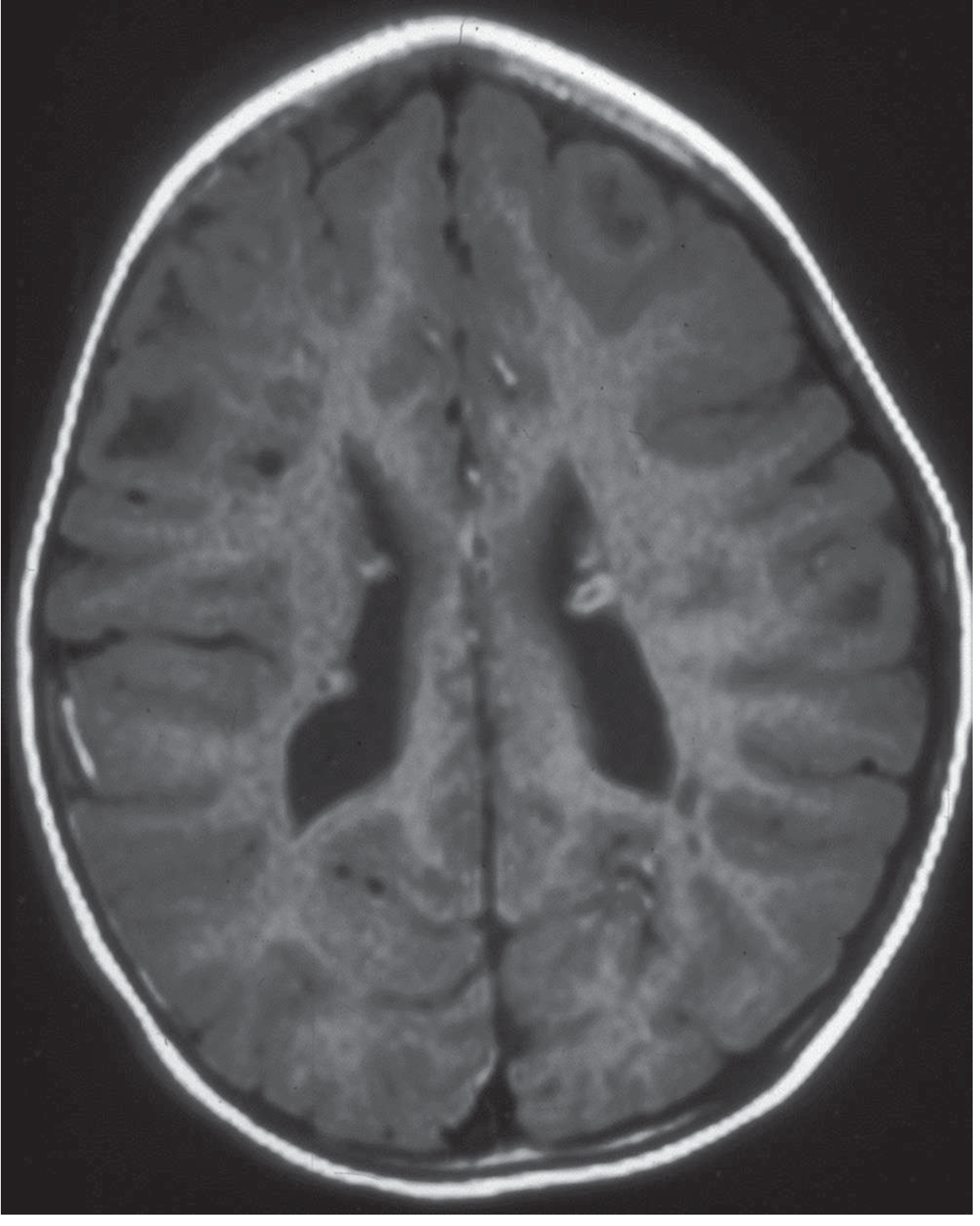 | White matter radial migration lines | T2-hyperintense lines radiating from ventricle to cortex |
