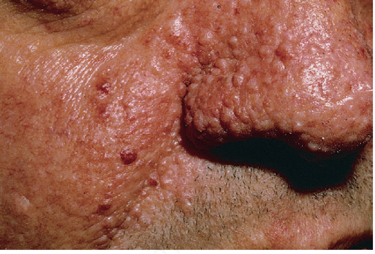 | Fibrous cephalic plaque | Firm fibrous plaque on forehead/scalp; marker for severe intracranial involvement | Present |
