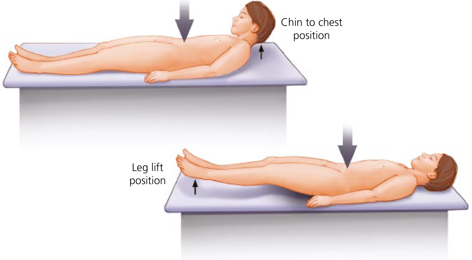 - Pacientul în decubit dorsal, genunchii ușor flexați (relaxarea musculaturii abdominale)