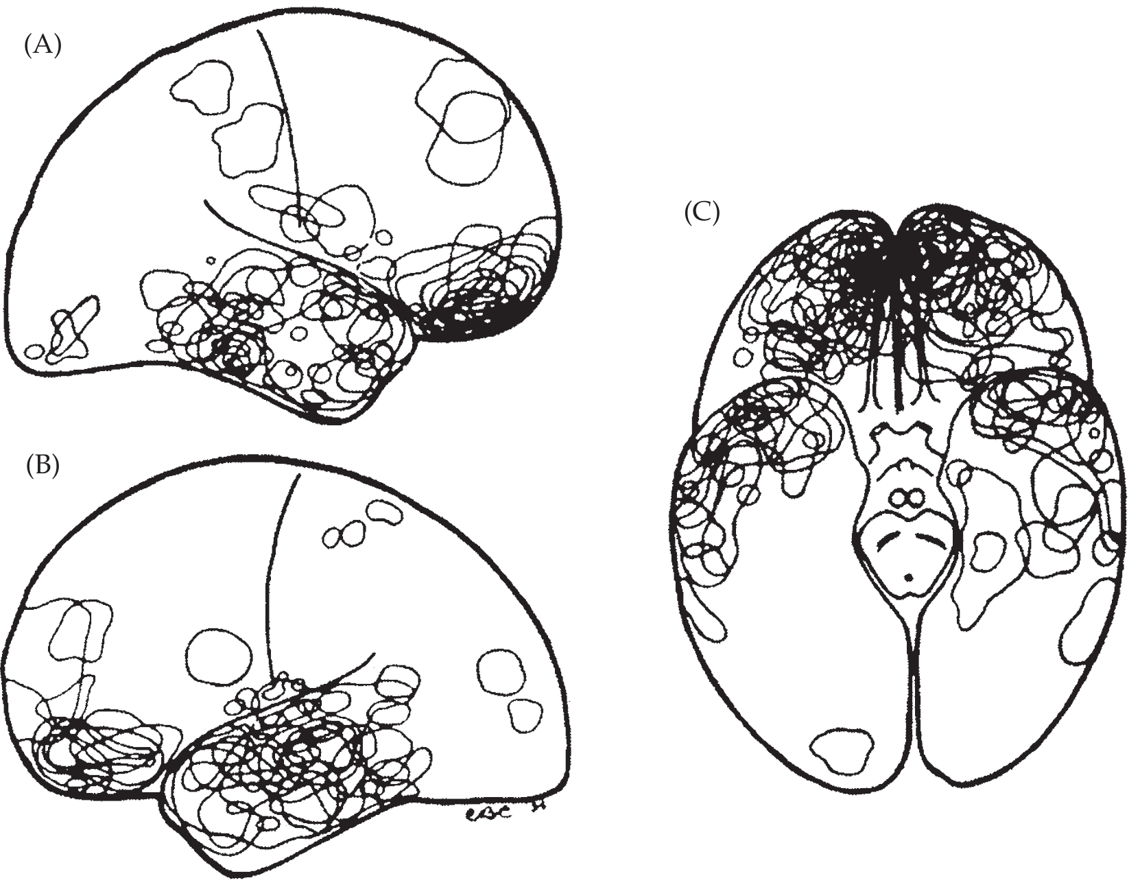 Common sites of cerebral contusion — right hemisphere (A), left hemisphere (B), inferior view (C). — Neuroanatomy through Clinical Cases