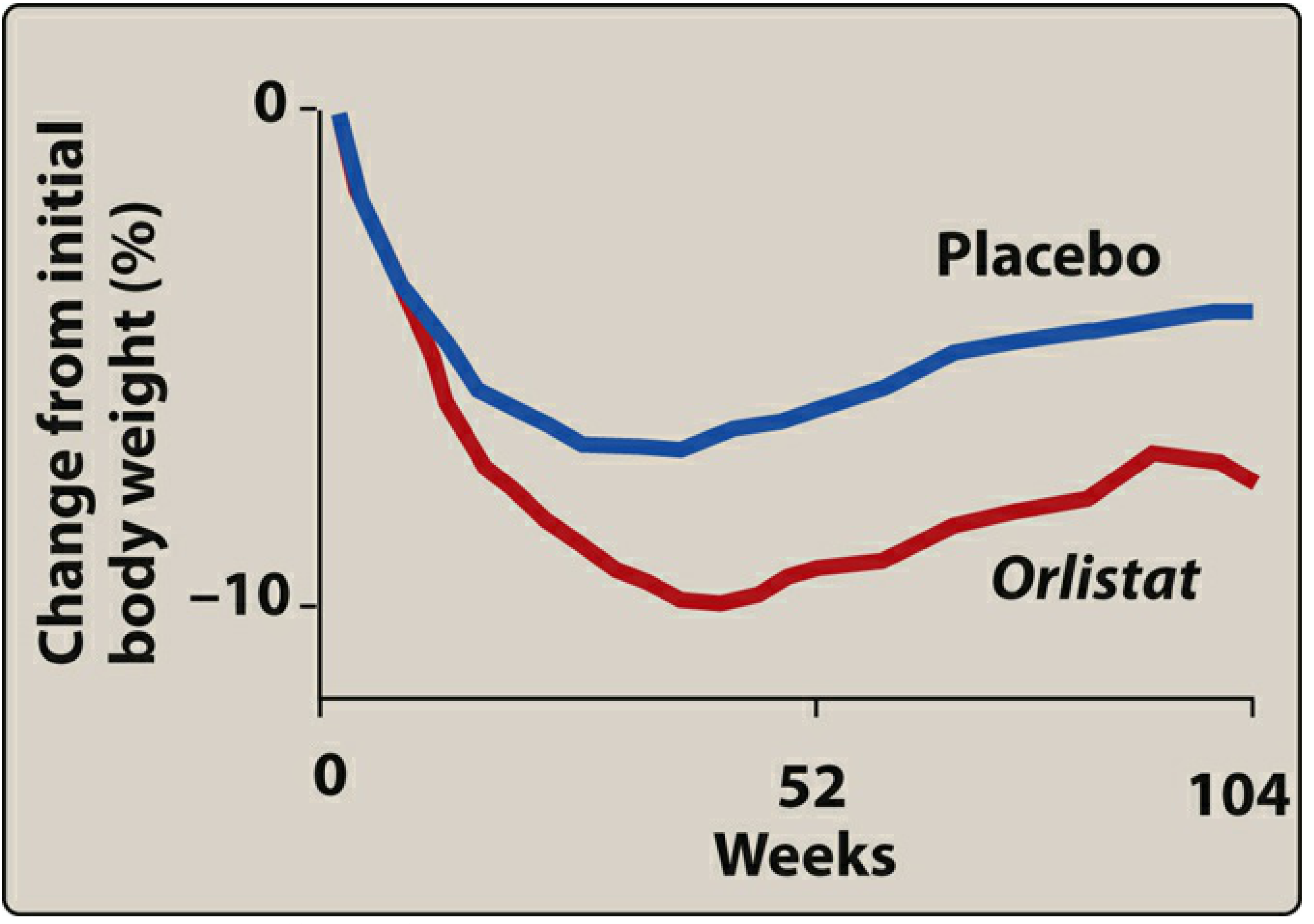 Figure: Orlistat (red) produces a sustained ~10% reduction in body weight at ~52 weeks compared to placebo (blue). Some weight regain occurs but orlistat maintains superior weight loss through 104 weeks.