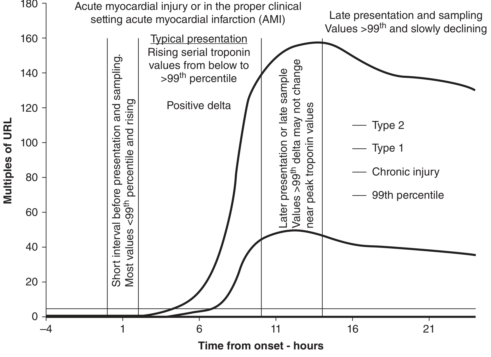 Rise and fall profile of cardiac troponin for Type 1 MI, Type 2 MI, and chronic myocardial injury. Type 1 reaches markedly higher peak values than Type 2. Chronic injury remains chronically elevated above the 99th percentile URL but without the acute rise-fall pattern. — Tietz Textbook of Laboratory Medicine, 7th Ed.