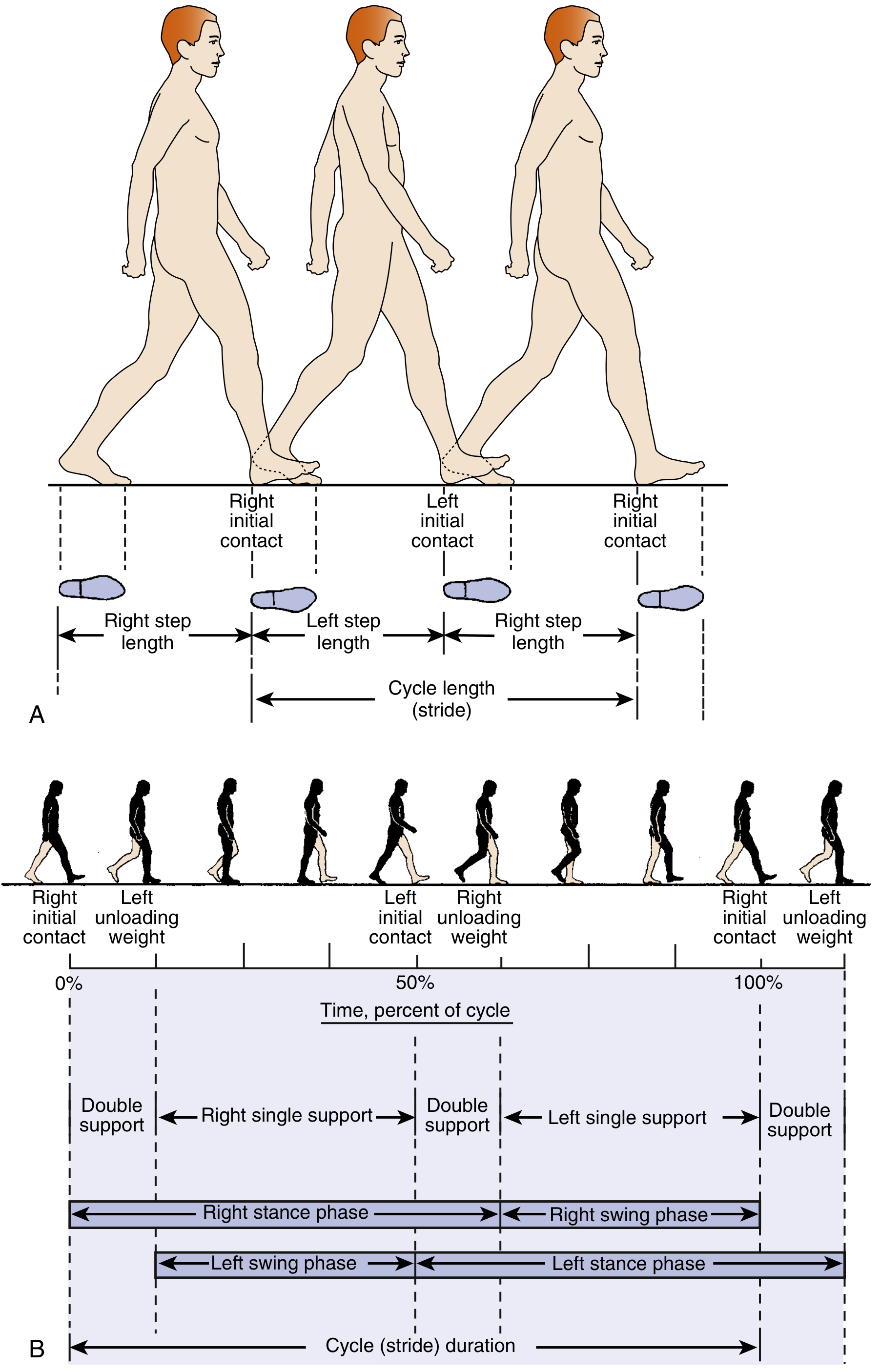 FIG. 10.1 — Dimensions of the walking cycle (Miller's Review of Orthopaedics)