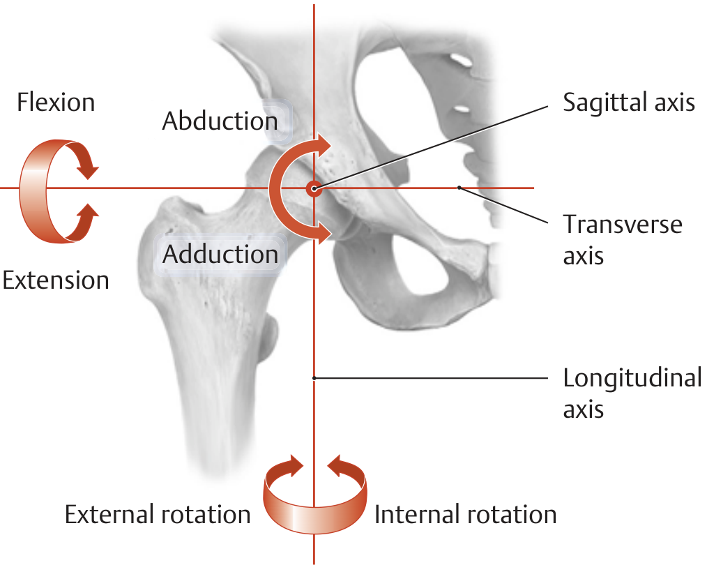 The hip has three principal axes of motion, all passing through the center of the femoral head (the rotational center), giving it three degrees of freedom: