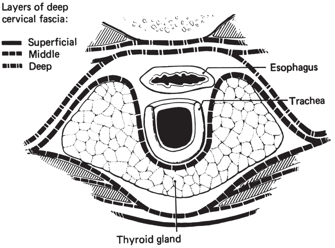 | Retropharyngeal | Between posterior visceral fascia (buccopharyngeal) and alar fascia; extends from skull base to T1–T2 | Loose connective tissue, lymph nodes of Rouvière (present in children <5 yr) | Danger space, mediastinum (allows inferior spread) |