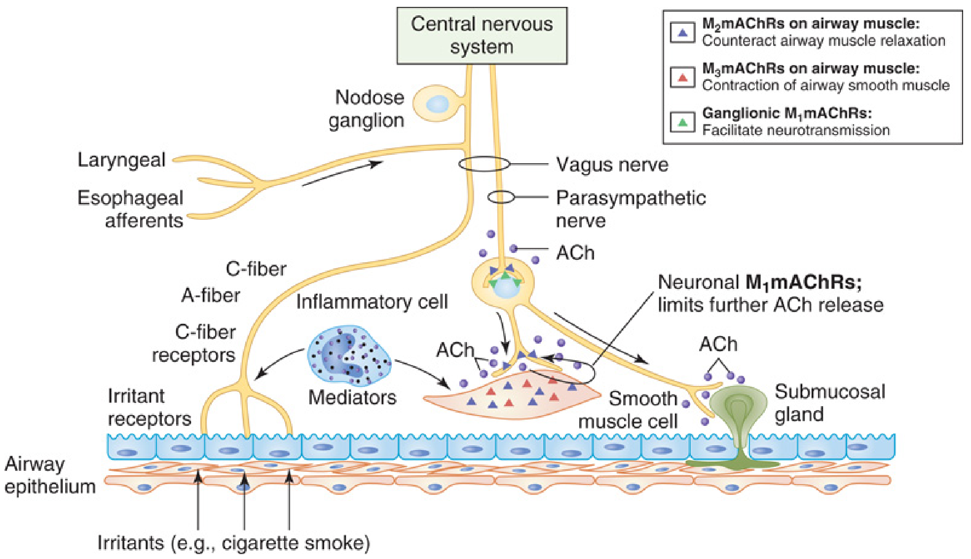 This is the dominant neural pathway for bronchoconstriction. Anticholinergic drugs (Ipratropium, Tiotropium) block M3 receptors and are used as bronchodilators.
