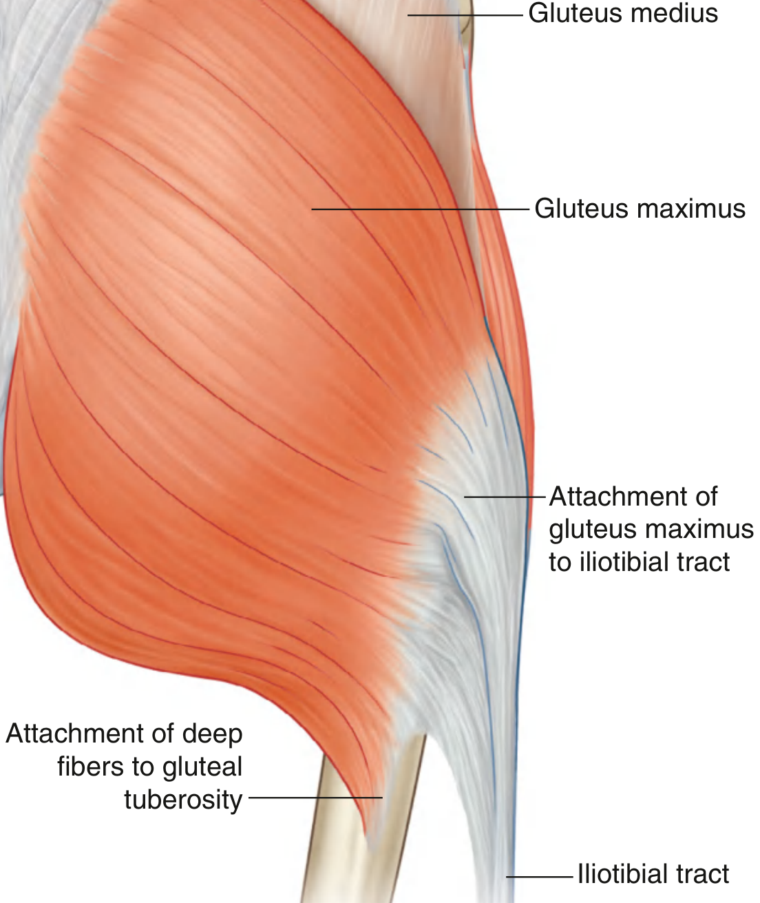 - Insertion: Oblique line between the lesser trochanter and linea aspera (posterior femur)