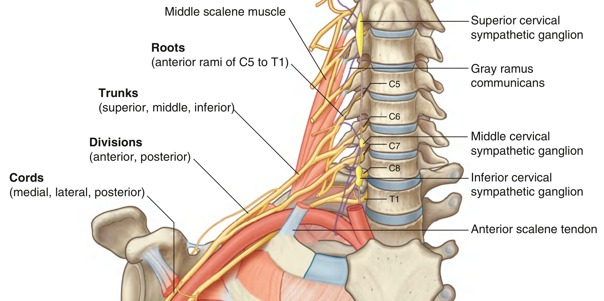 | Roots | C5, C6, C7, C8, T1 | Anterior rami; between scalene muscles |