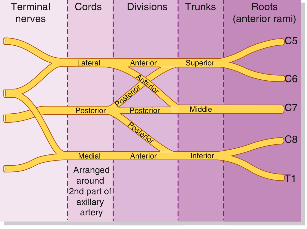 | Trunks | Superior, Middle, Inferior | C5+C6 = Superior; C7 alone = Middle; C8+T1 = Inferior |