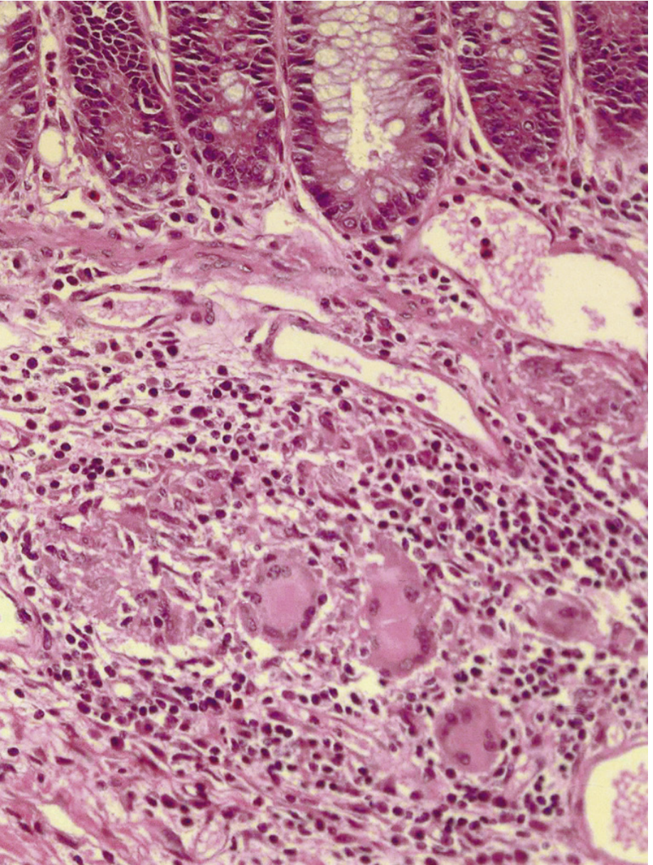 Photomicrograph of a typical CD granuloma in an endoscopic biopsy: loosely formed collection of multinucleated giant cells and epithelioid macrophages. No central caseation. (Sleisenger and Fordtran's GI and Liver Disease)