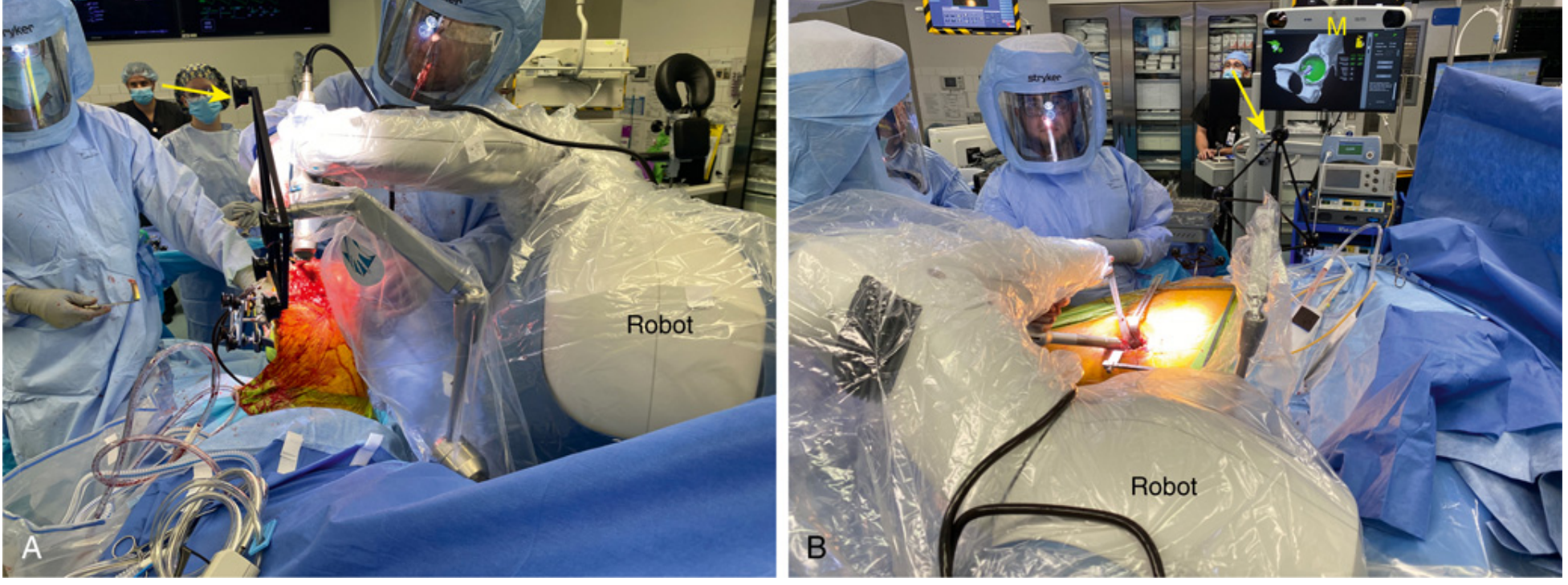 (A) MAKO robotic-assisted TKA — the robotic arm approaches from the contralateral side. The yellow arrow indicates the navigation system displaying real-time alignment.