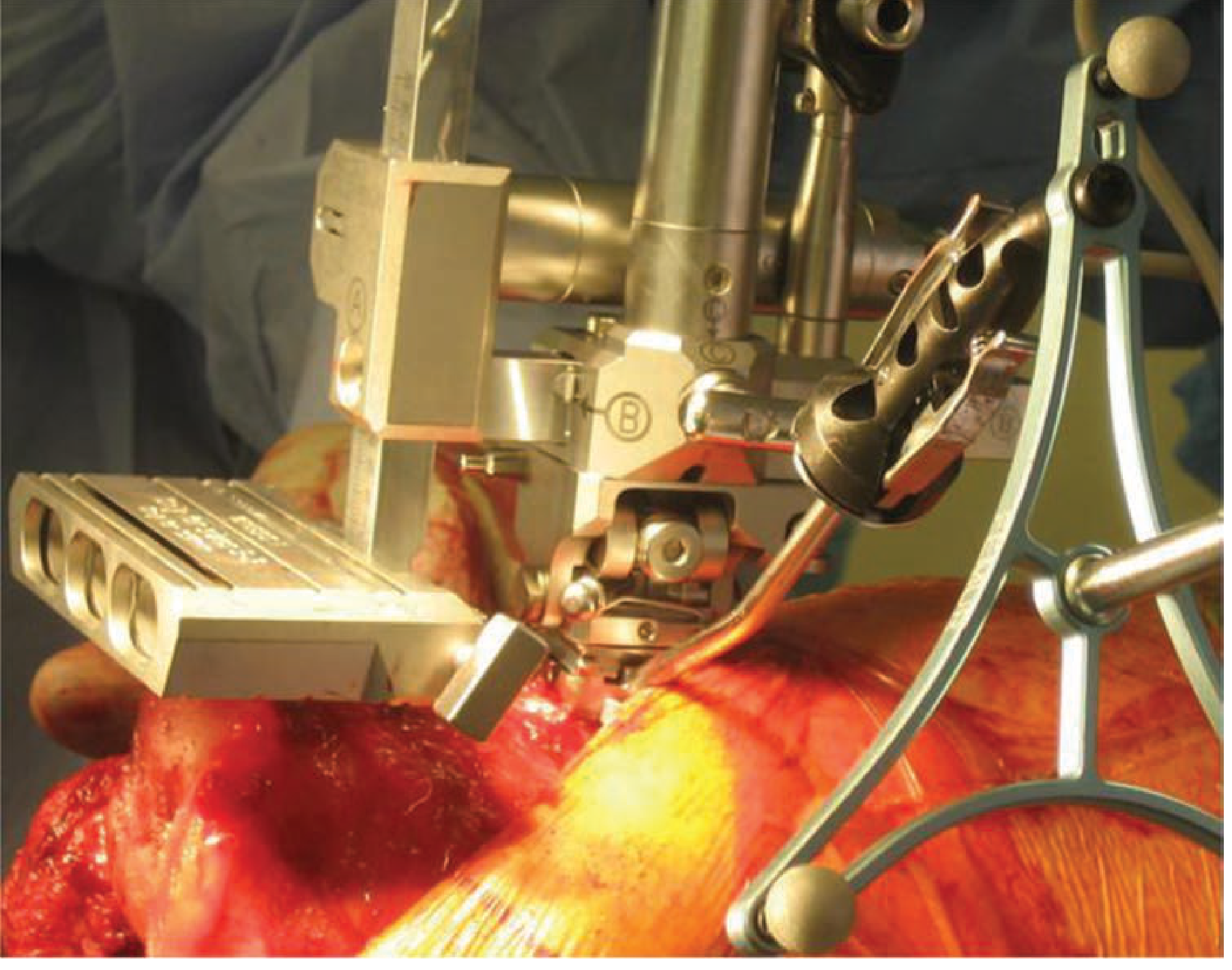 - Patient-specific instrumentation (PSI): Preoperatively manufactured jigs based on CT/MRI data — a lower-cost alternative to active navigation