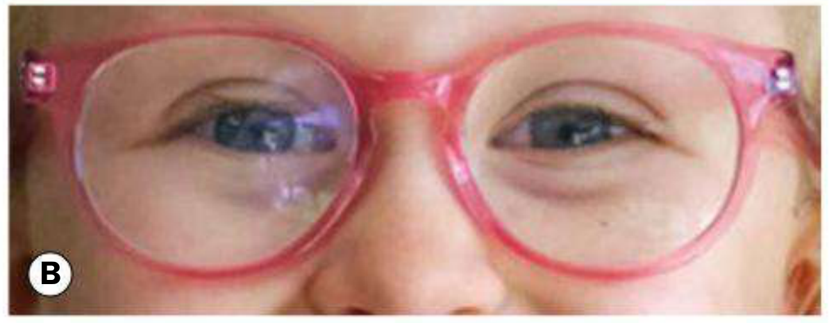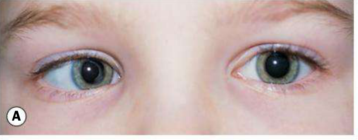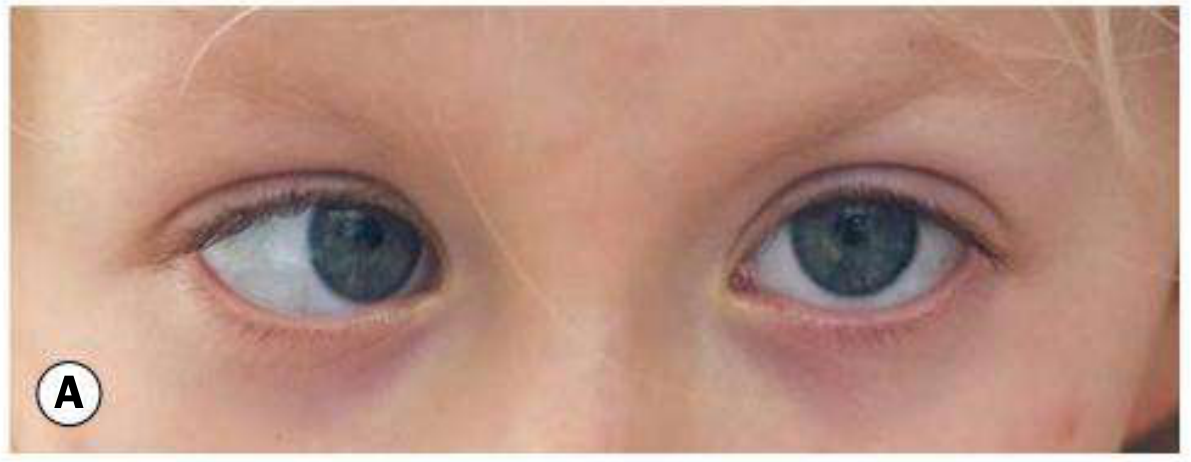 Fig. 18.55 — Fully accommodative esotropia. (A) Right esotropia without glasses; (B) straight eyes with glasses. — Kanski's Clinical Ophthalmology, p. 755