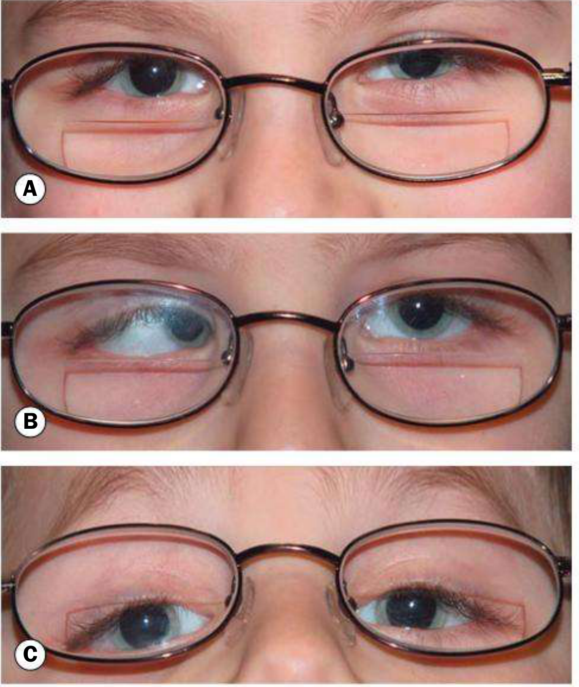Fig. 18.58 — Convergence excess esotropia. (A) Straight for distance; (B) right esotropia for near; (C) straight through bifocals. — Kanski's Clinical Ophthalmology, p. 756