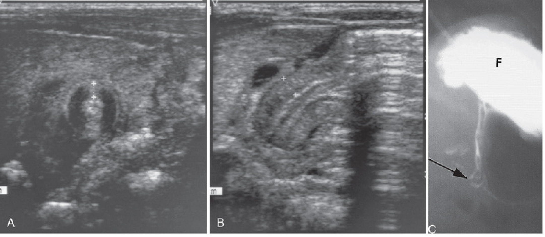 Hypertrophic pyloric stenosis: ultrasound and contrast radiograph. — The Developing Human: Clinically Oriented Embryology
