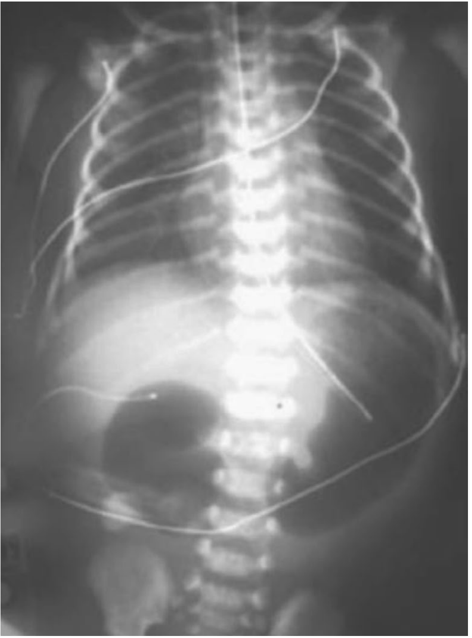 - If distal gas is present, an upper GI contrast study should be performed to exclude malrotation with midgut volvulus (a surgical emergency)