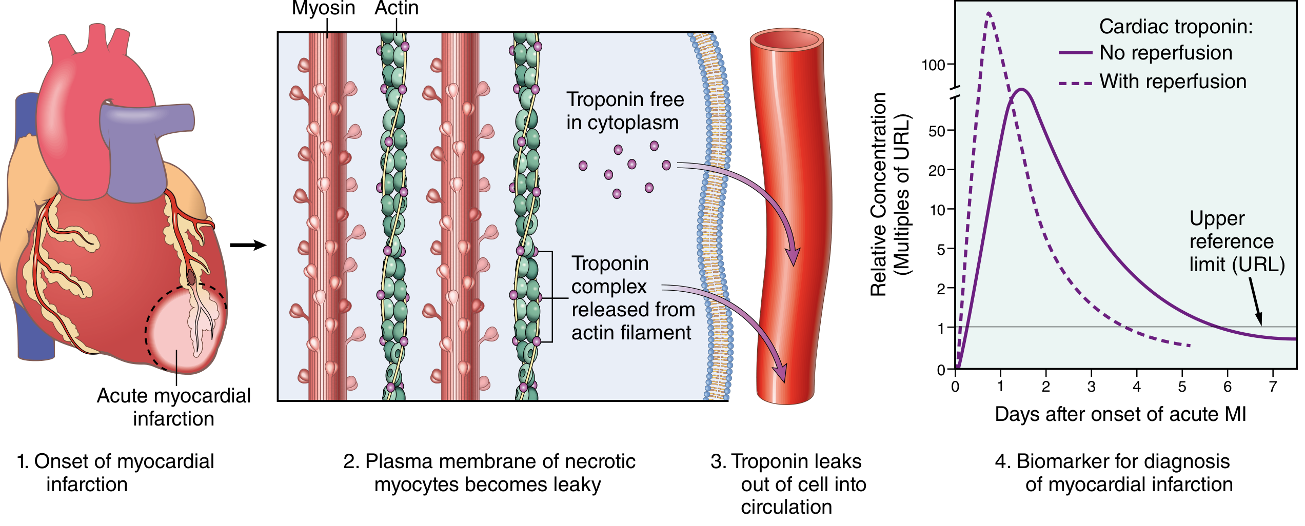 | 3rd | Myoglobin | 1–4 hours | Myocyte necrosis (small, freely diffusible protein) |