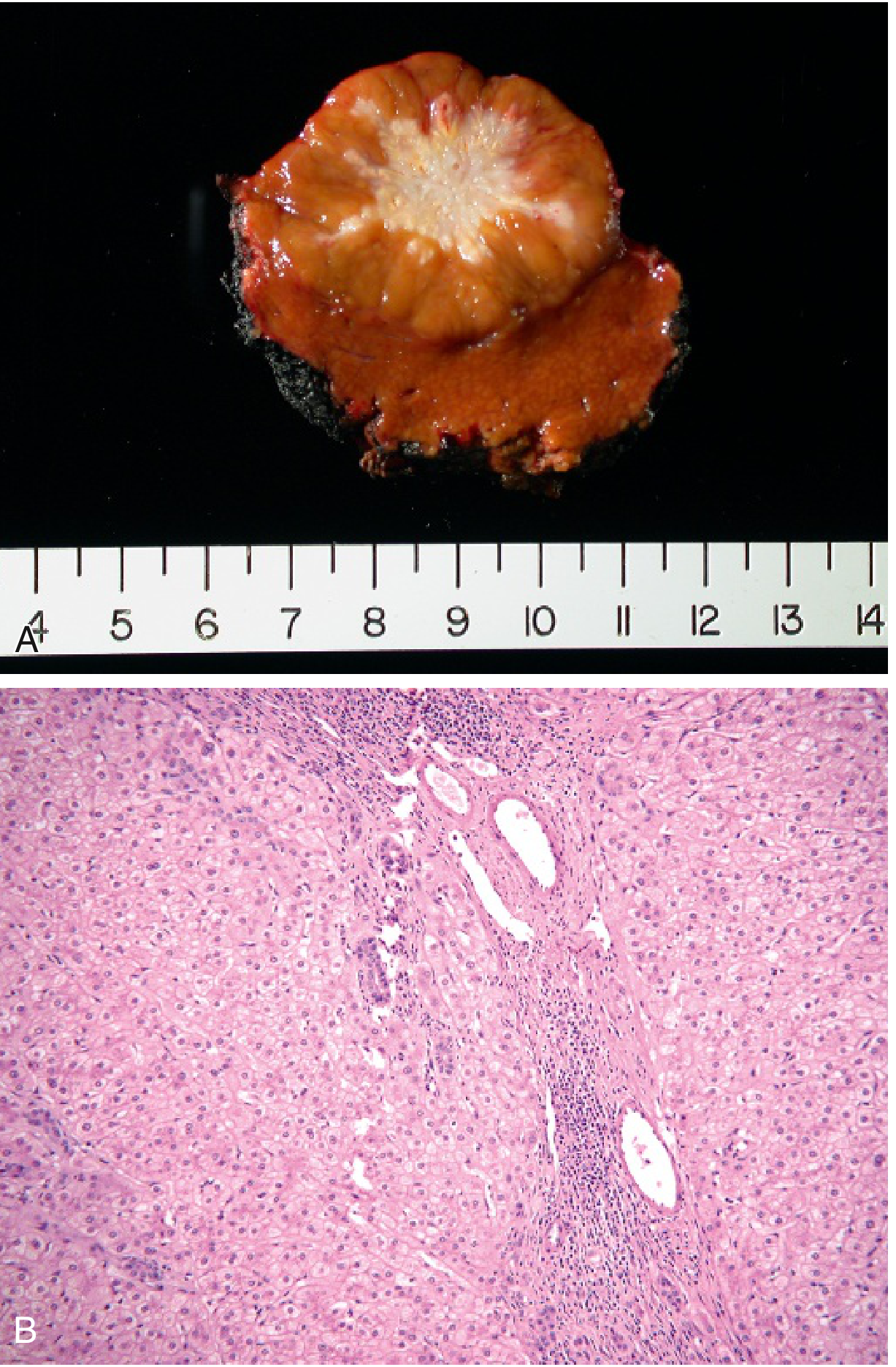 Focal nodular hyperplasia: central stellate scar (A) with broad fibrous scar and ductular elements (B).