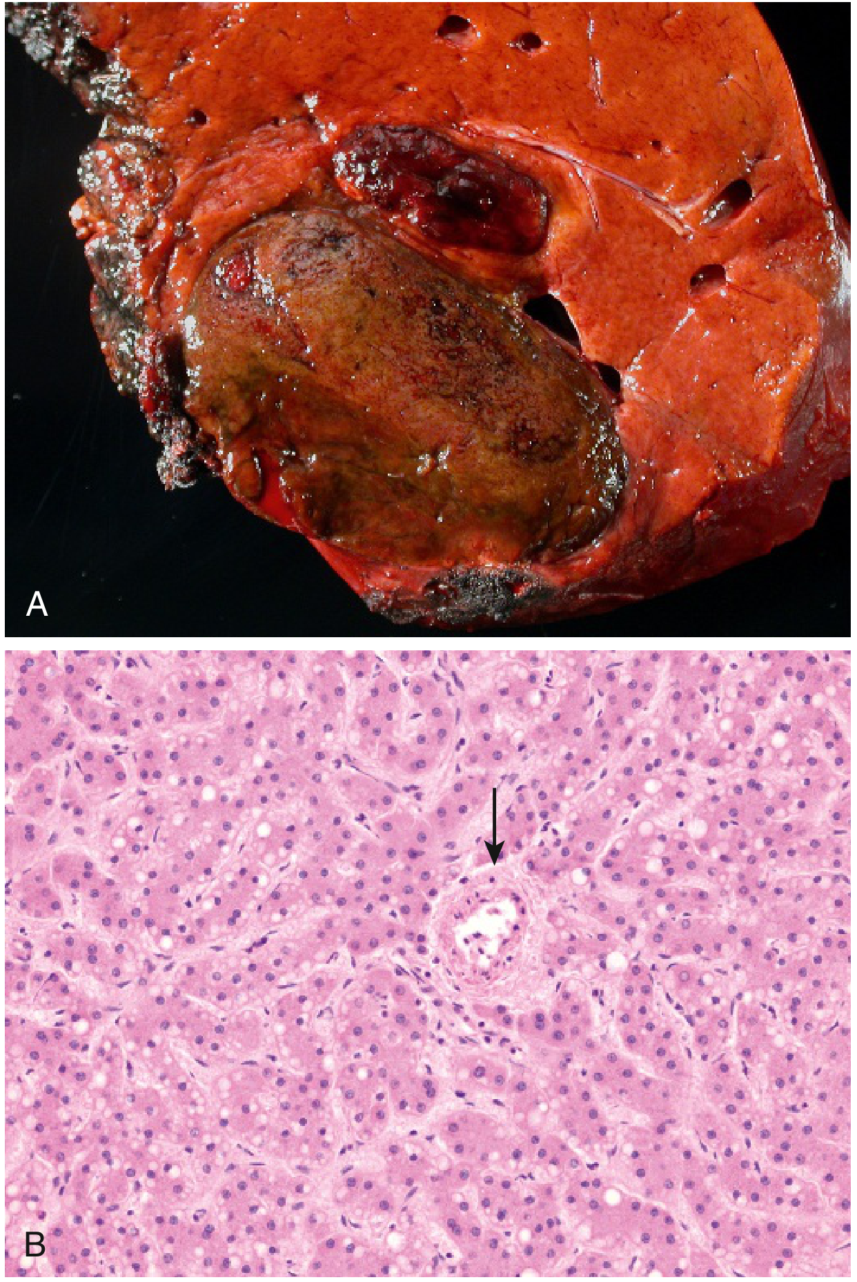 Hepatic adenoma: (A) Resected specimen. (B) Cords of hepatocytes with arterial vascular supply (arrow) and no portal tracts.