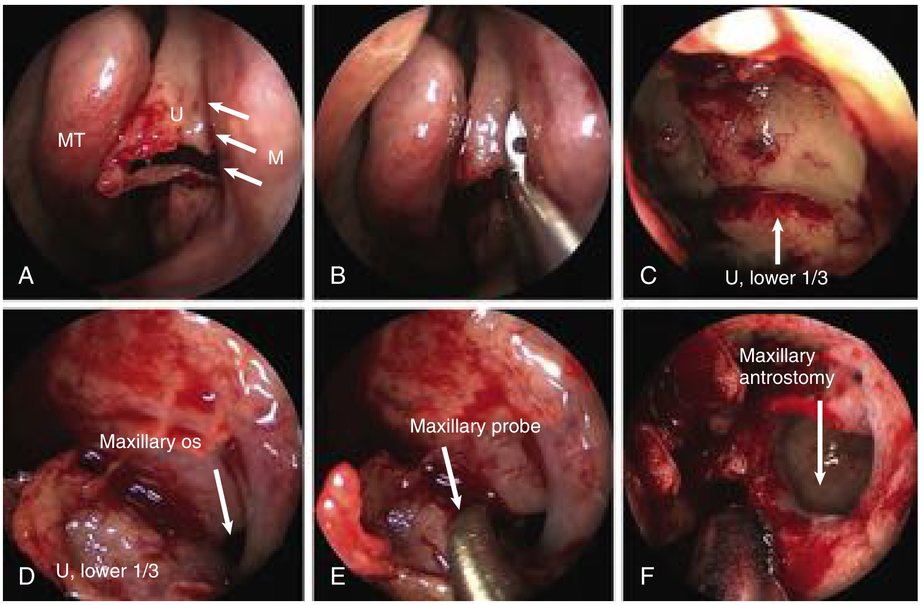 Endoscopic views of retrograde uncinectomy and maxillary antrostomy. (A) Uncinectomy initiated with backbiter at junction of upper two-thirds/lower one-third. (B) Upper uncinate removed. (C–D) Lower one-third uncinate exposed; maxillary os visible. (E) Maxillary probe dilating ostium. (F) Completed pear-shaped maxillary antrostomy. MT = middle turbinate.