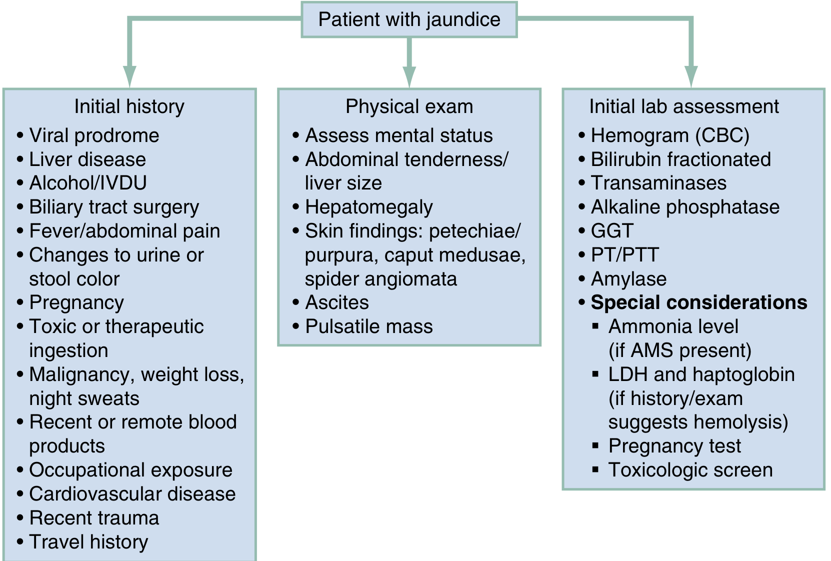 Jaundice is classified into three major pathophysiologic categories, each with distinct subtypes: