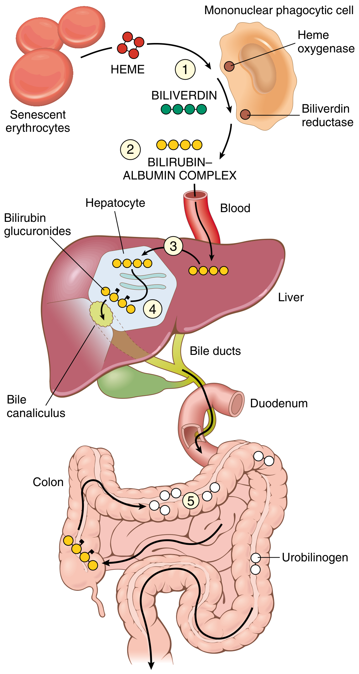 - Production (85%): Senescent red blood cells are phagocytosed by mononuclear phagocytes in the spleen, liver, and bone marrow. Heme is oxidized by heme oxygenase to biliverdin, then reduced to unconjugated (indirect) bilirubin by biliverdin reductase. The remaining 15% comes from turnover of heme-containing hepatic proteins (cytochrome P-450).