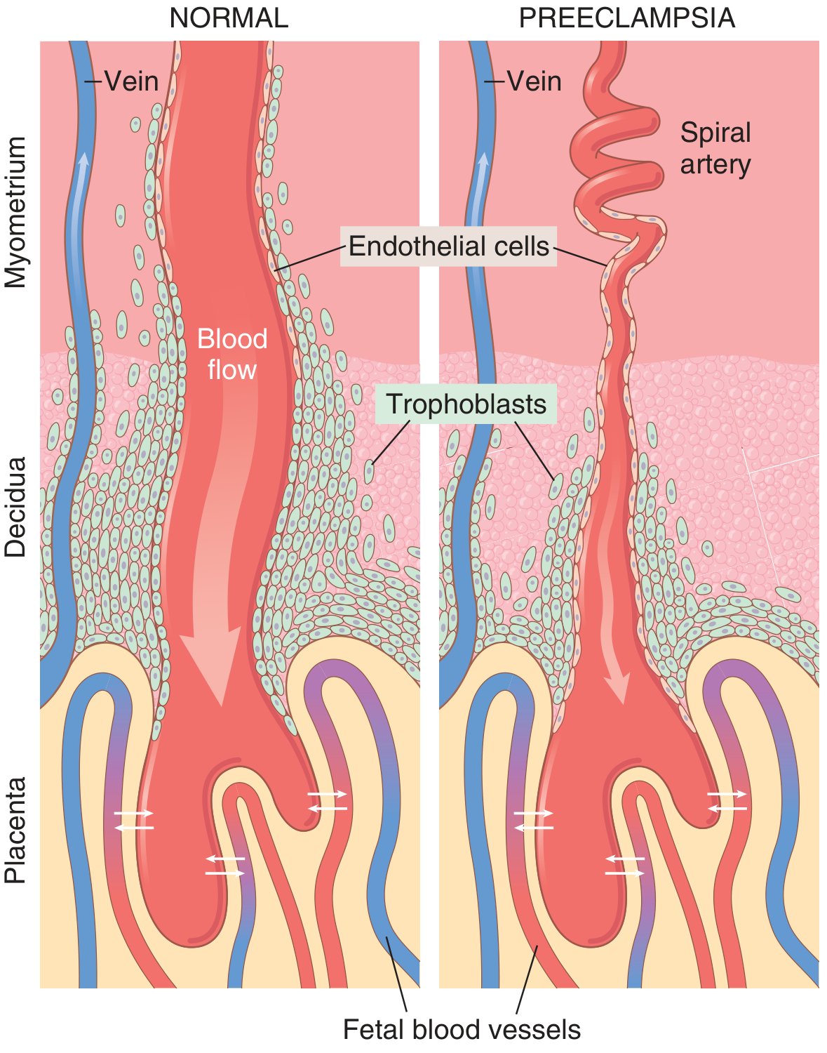 Figure 1. In normal pregnancy (left), trophoblasts invade and dilate the spiral arteries into wide, low-resistance vessels. In preeclampsia (right), trophoblastic invasion is incomplete, leaving the arteries narrow and coiled with resultant placental ischaemia. — Guyton and Hall Textbook of Medical Physiology, p. 1041