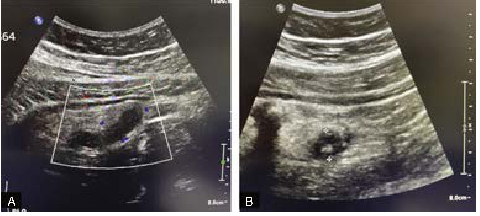RLQ ultrasound in a 10-year-old with abdominal pain: (A) dilated fluid-filled tubular structure with increased vascularity; (B) echogenic focus = appendicolith. Both findings consistent with acute appendicitis.