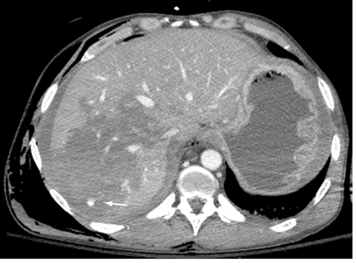 Grade IV liver laceration with active extravasation (arrow) — Sabiston Textbook of Surgery, p. 692