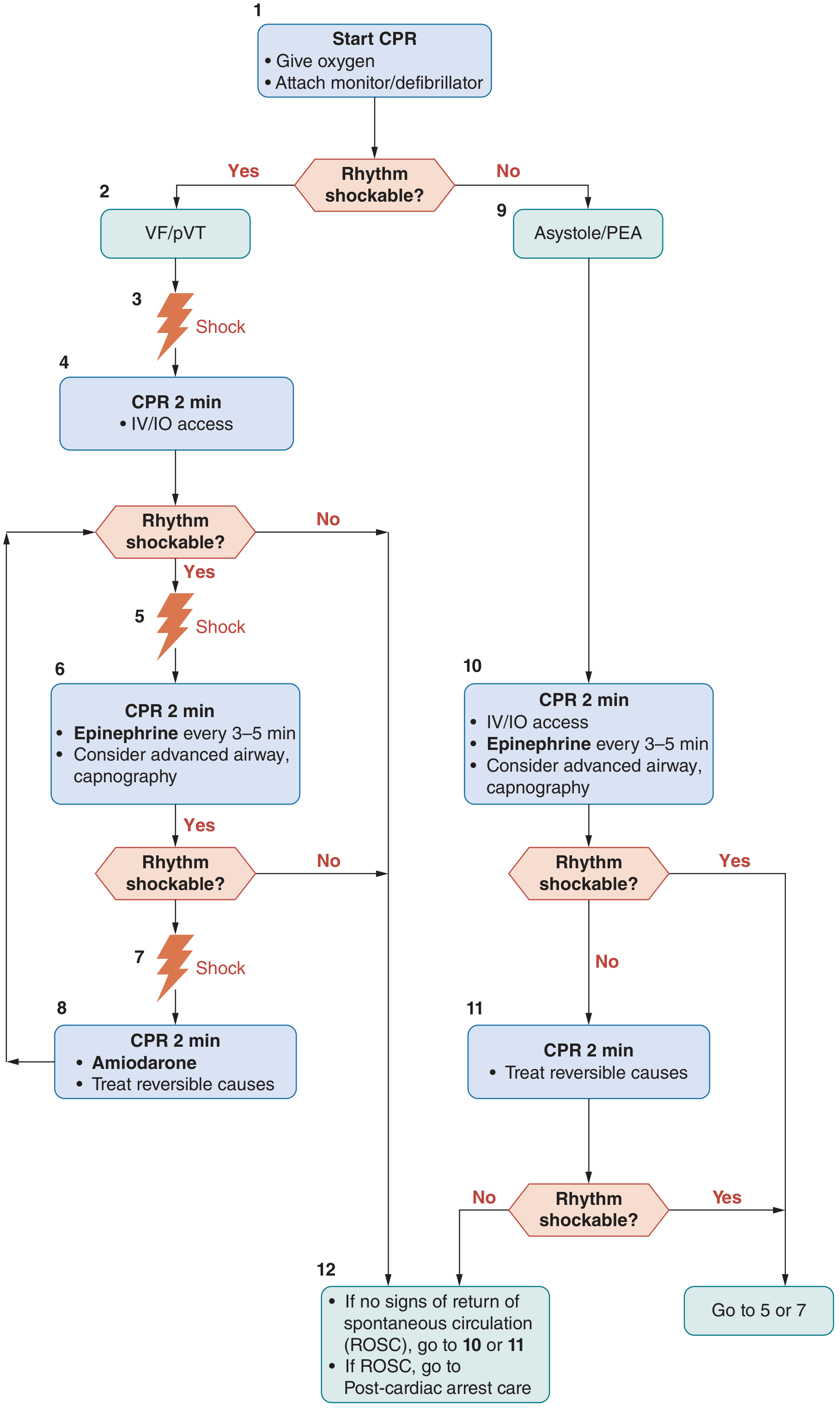- If shockable rhythm persists → repeat maximal energy shock every 2 min cycle