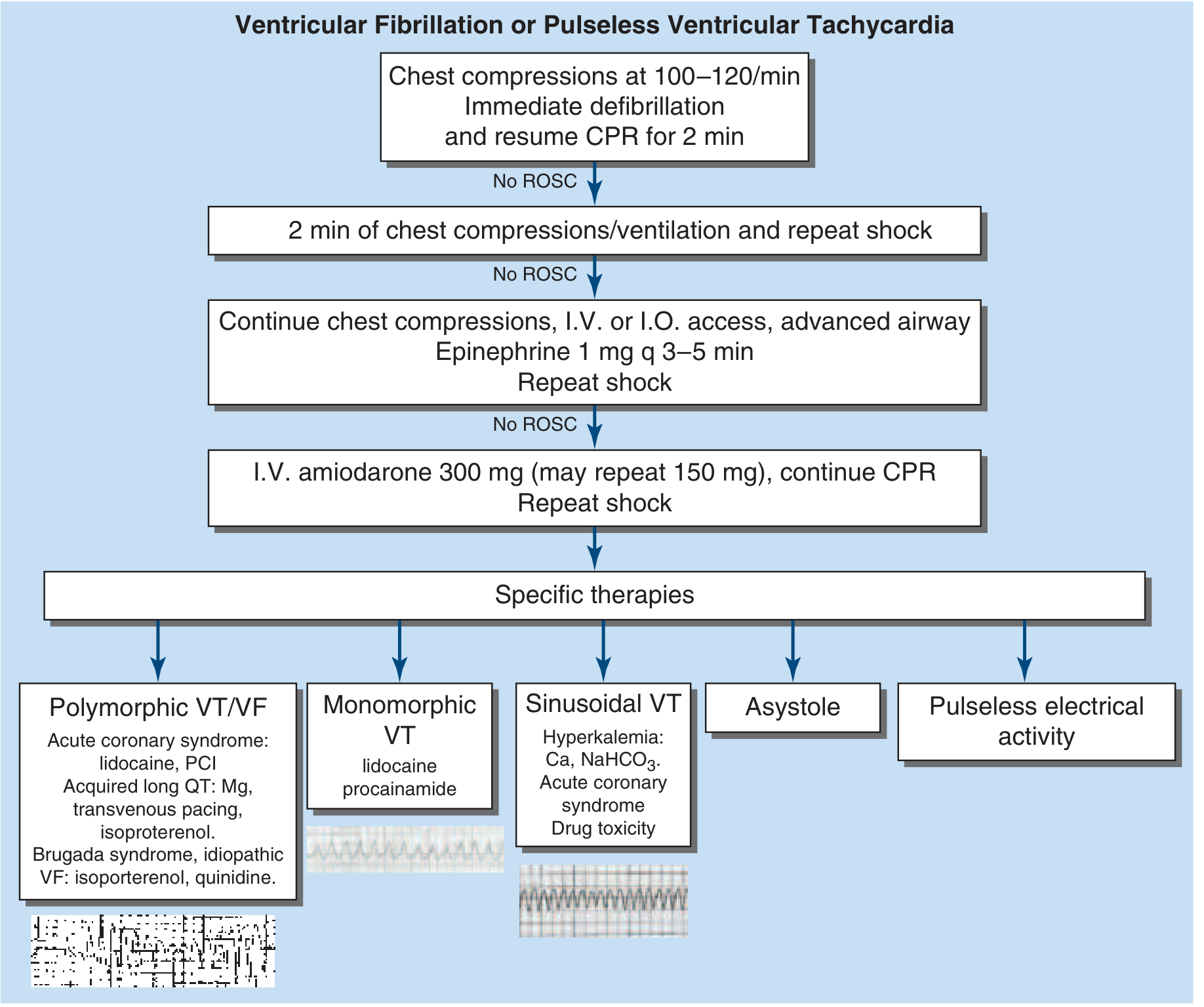 - No ROSC → Amiodarone 300 mg IV bolus (repeat 150 mg if recurs) + repeat shock
