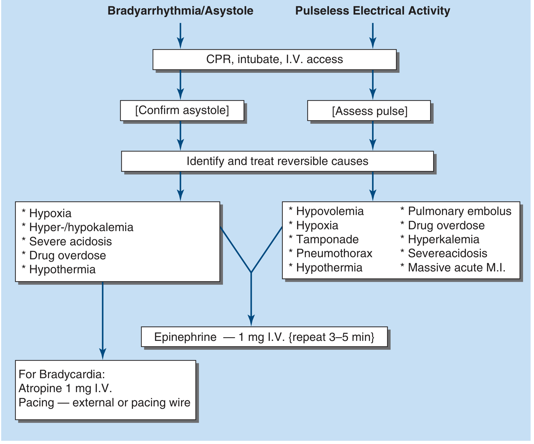 - Atropine 1 mg IV (note: atropine is NOT recommended for asystole/PEA per current AHA guidelines — only for bradycardic rhythms)