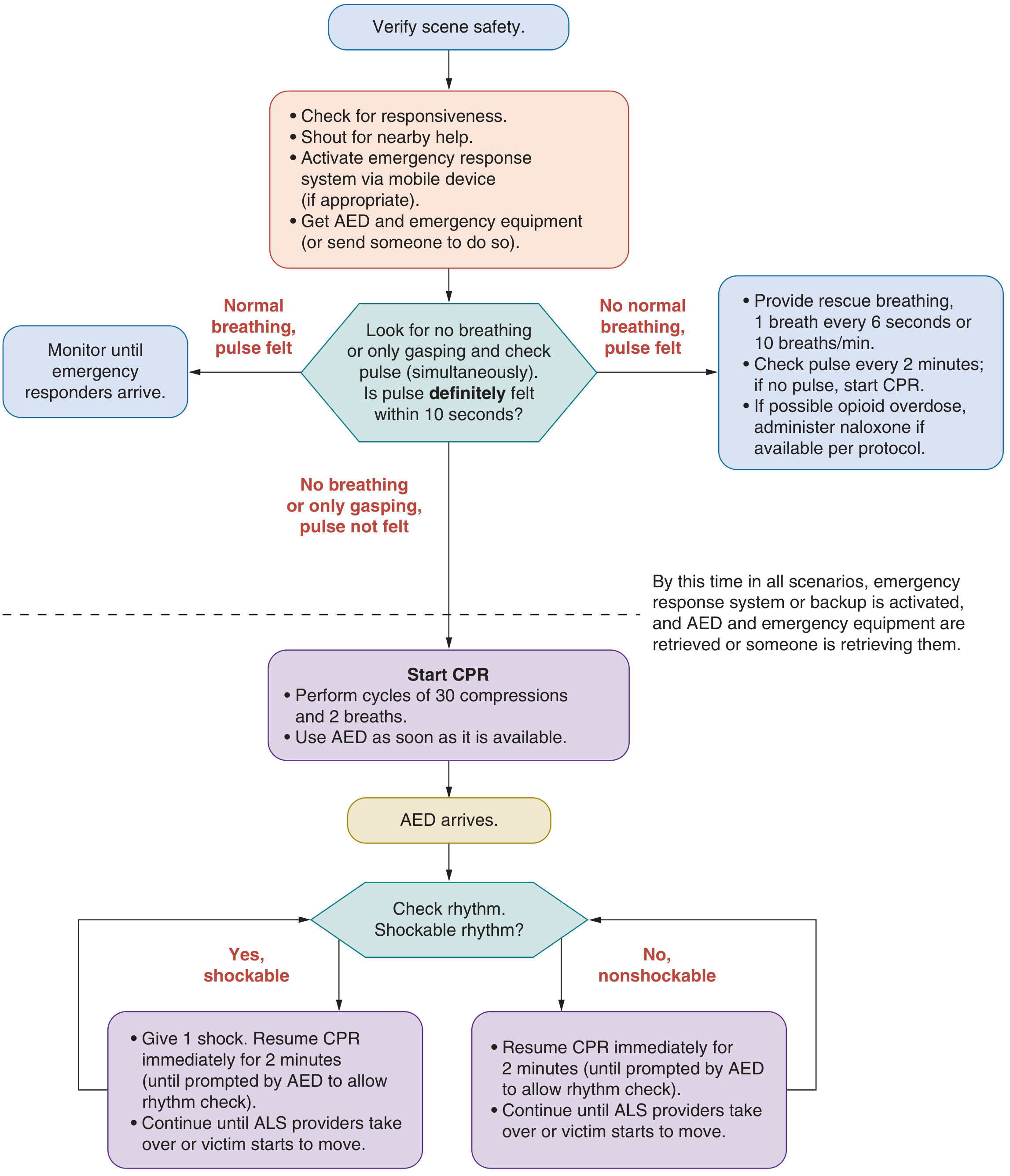 - Apply AED as soon as available — AED use should precede CPR check in unwitnessed arrests