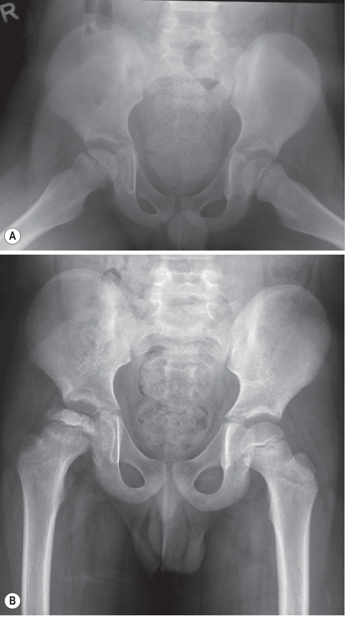 Fig. — Perthes Disease. (A) Frog lateral at presentation showing the crescent sign (subchondral lucency) of early AVN of the right capital femoral epiphysis. (B) Rapid progression with irregularity, loss of height and sclerosis of the femoral head 8 months later. — Grainger & Allison's Diagnostic Radiology