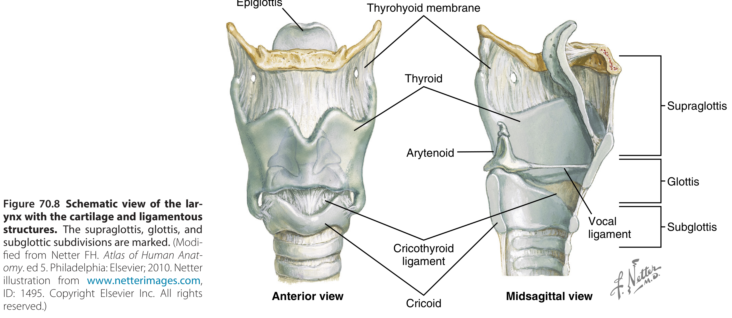 Anterior and midsagittal views of the larynx showing cartilage and ligamentous structures. — Murray & Nadel's Textbook of Respiratory Medicine