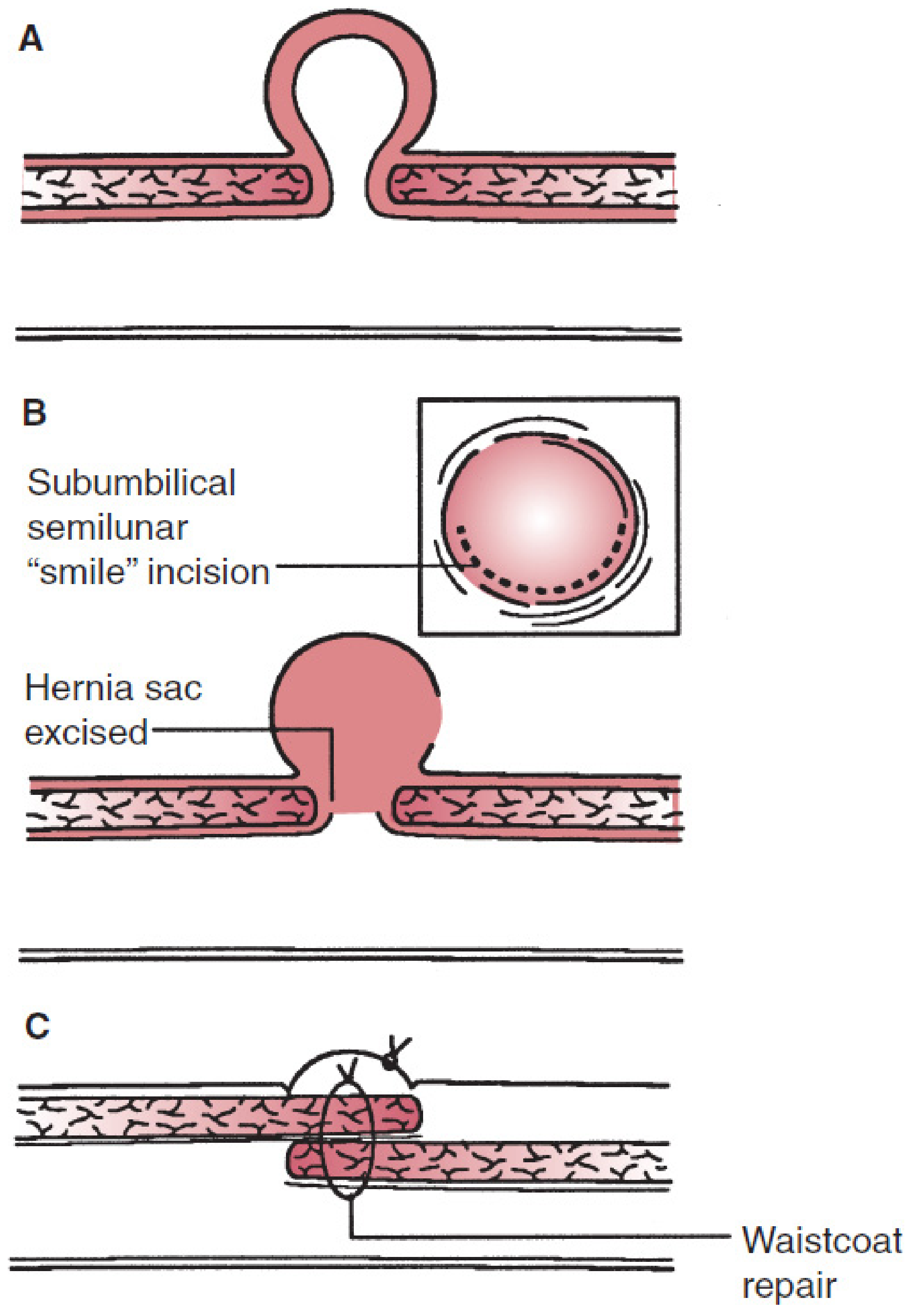 Note: Bailey & Love's Short Practice of Surgery is not available in this textbook library. The information below is drawn from equivalent authoritative surgical references: Schwartz's Principles of Surgery (11e), Mulholland & Greenfield's Surgery (7e), and Sabiston Textbook of Surgery — all of which cover umbilical hernia in the same standard manner taught in Bailey & Love.