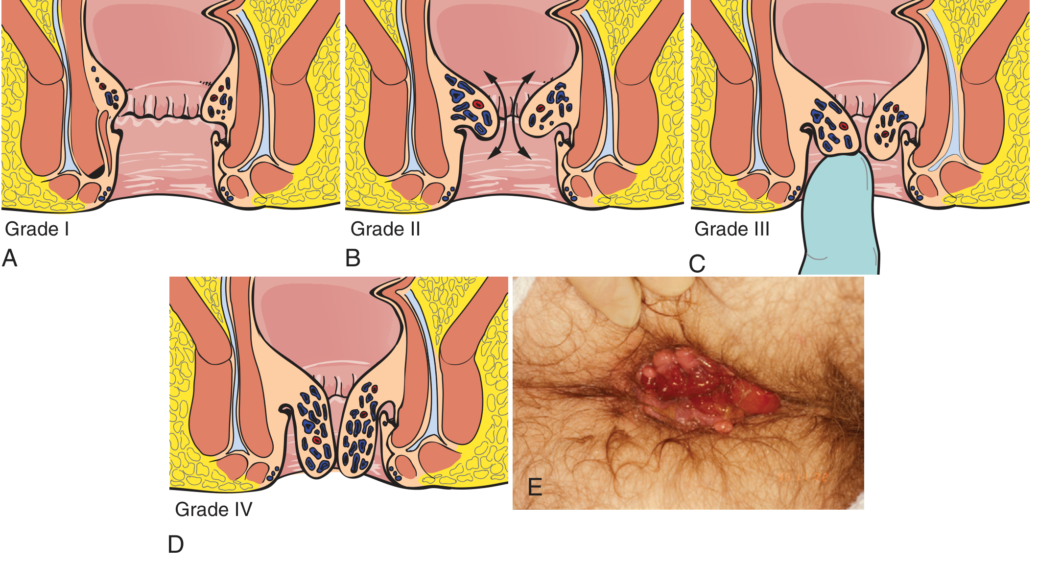 Grading of internal haemorrhoids: (A) Grade I — cushions present, no prolapse; (B) Grade II — prolapse with spontaneous reduction; (C) Grade III — prolapse requiring digital reduction; (D) Grade IV — permanently prolapsed; (E) Clinical photo of prolapsed/gangrenous haemorrhoids