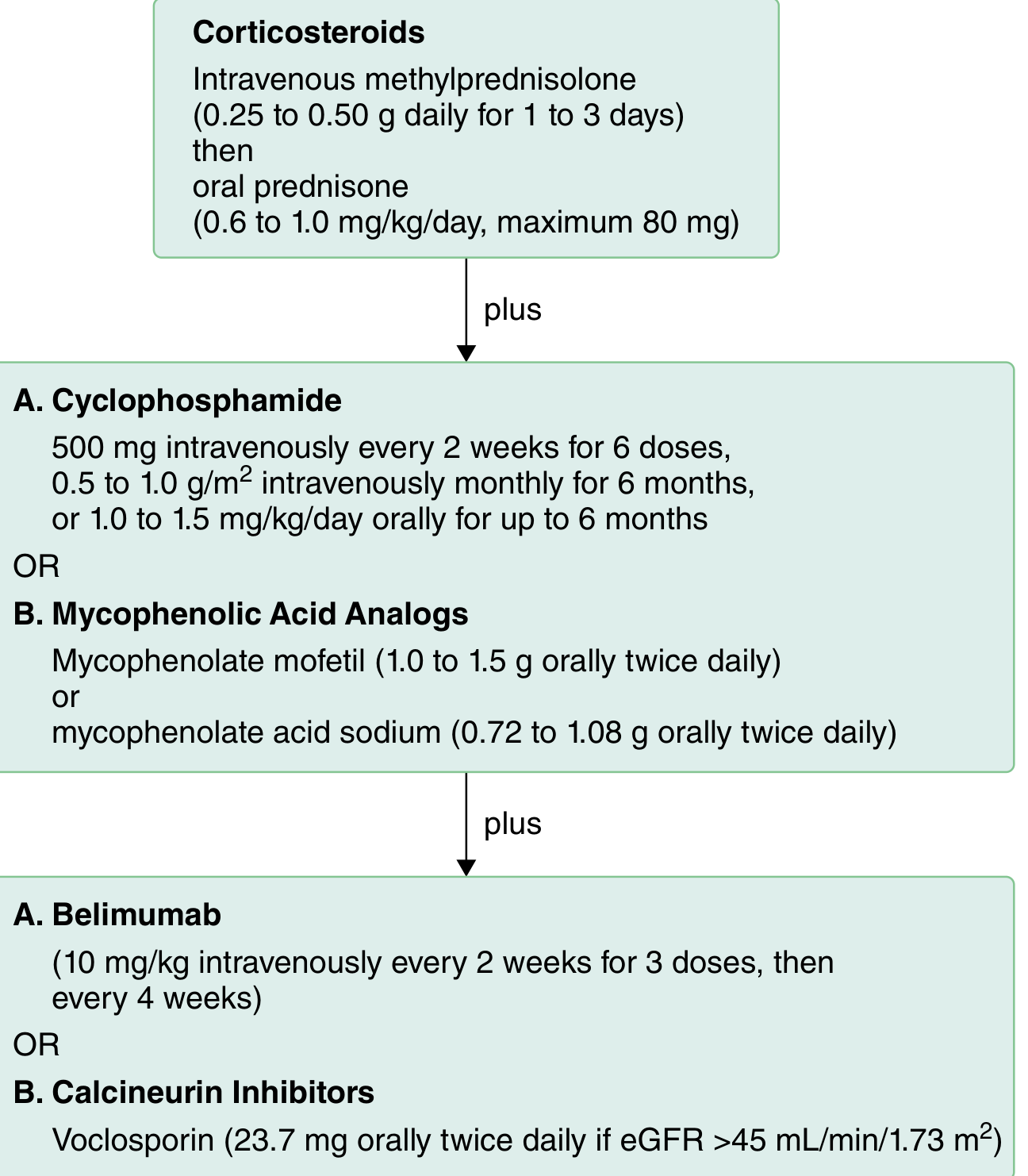 - Belimumab (anti-BAFF monoclonal antibody): 10 mg/kg IV every 2 weeks × 3 doses, then every 4 weeks — added to standard therapy to increase response rates