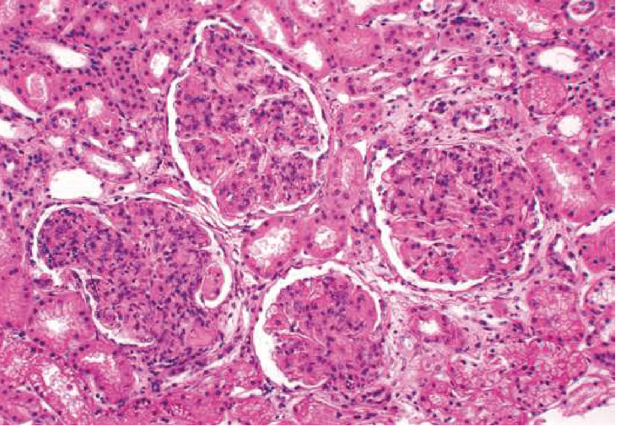 Diffuse proliferative lupus nephritis (Class IV) — H&E showing endocapillary proliferation involving all glomeruli. — Goldman-Cecil Medicine