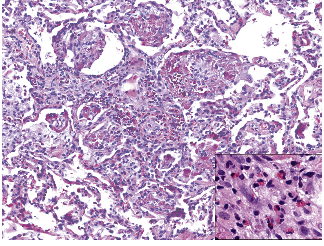 - Granulomas, alveolar hemorrhage, and non-necrotic perivascular inflammation reported