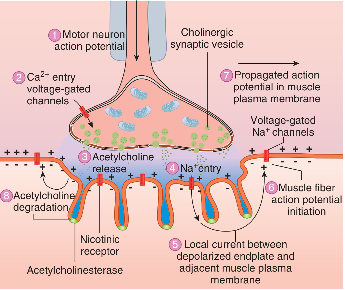 - Ca²⁺ influx triggers exocytosis of ACh-containing synaptic vesicles into the synaptic cleft